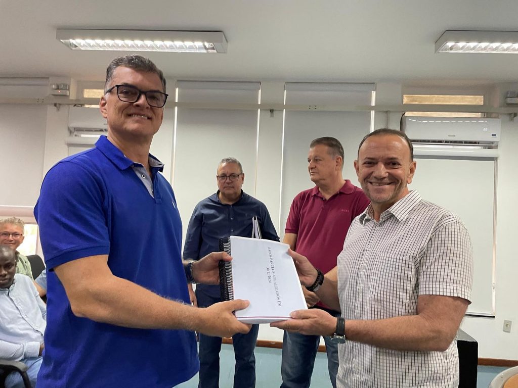 O prefeito Edinho entregou ao prefeito eleito Luis Claudio Lapena Barreto o relatório final de transição de governo, em ato realizado na manhã desta terça-feira (31), na sala de reuniões do Paço Municipal.