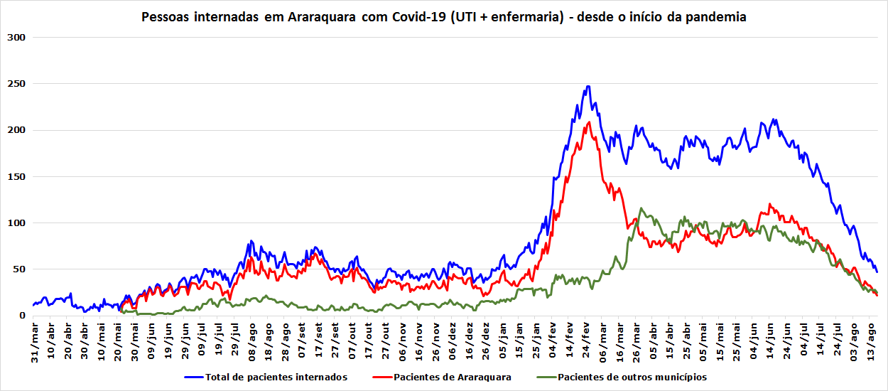 Araraquara chegou nesta terça-feira (17) ao menor índice de internações por Covid-19 deste ano: 47 pacientes contaminados pelo coronavírus estão em hospitais públicos e privados do município, segundo o boletim diário do Comitê de Contingência do Coronavírus.
